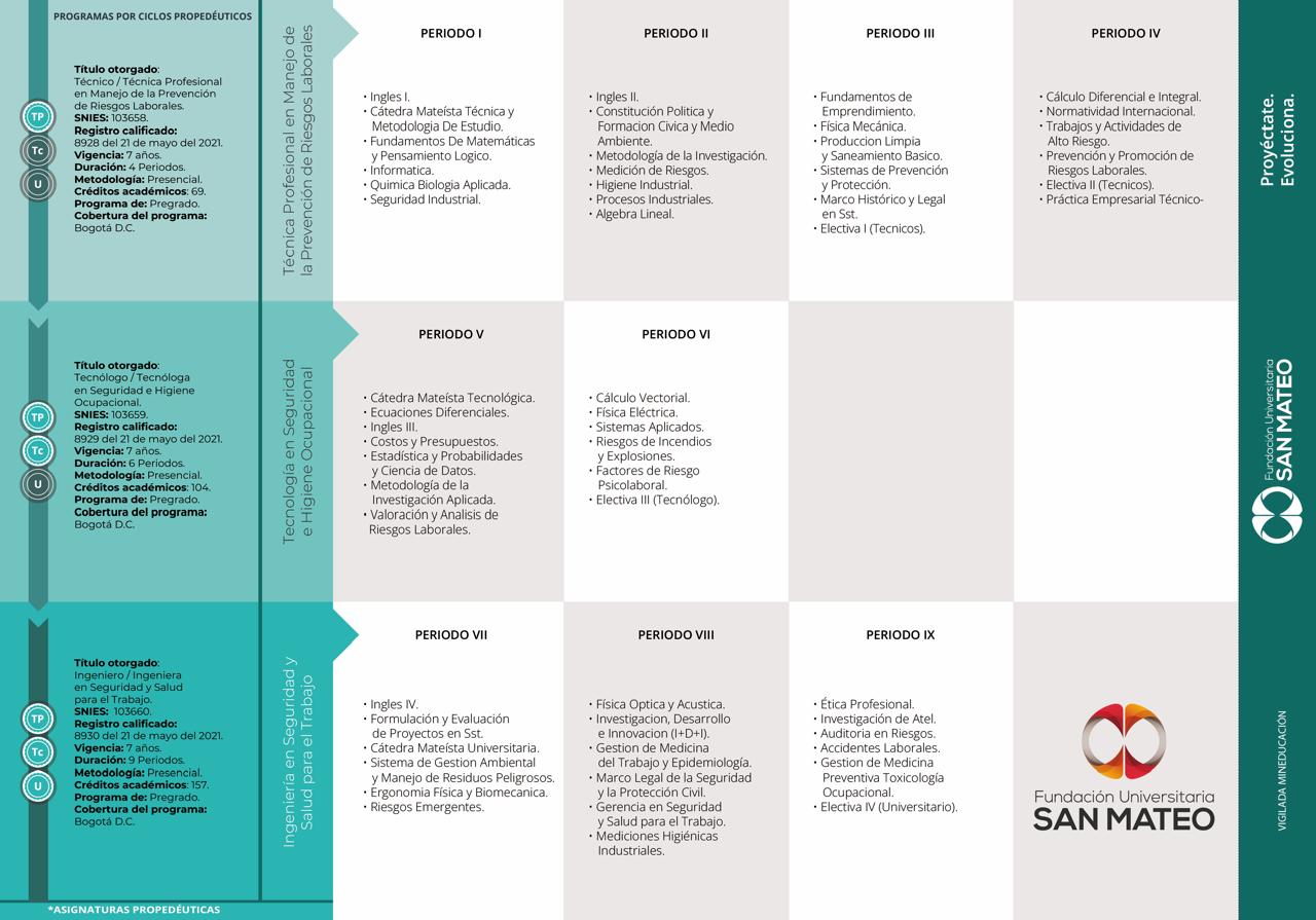 El Técnico Profesional en Manejo de la Prevención de Riesgos Laborales de la Fundación Universitaria San Mateo es un profesional integral, creativo, contextualizado, de rápida adaptación al cambio, capaz de usar sus habilidades, sus valores, los conocimientos en su disciplina para ejecutar las acciones relacionadas con el monitoreo, ejecución e implementación, de los programas en salud ocupacional, seguridad industrial, medio ambiente y sistemas integrales de calidad, que permitan, por medio de la interrelación con los avances tecnológicos, dar valor agregado a los productos y servicios y asegurar la integridad de los trabajadores y los bienes de las empresas de manera que favorezcan el desarrollo de organizaciones competitivas, competentes y de clase mundial de manera que estas puedan dar respuesta a los retos impuestos por los tratados internacionales. El programa propende por la formación de un profesional que como ciudadano sea respetuoso de los derechos, deberes, la diversidad cultural, y participe activamente en el logro de una mejor calidad de vida para quienes se encuentren en su entorno.